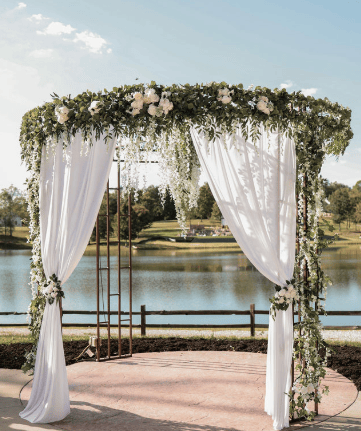 JCV has a four-tiered amphitheater with decorative hoopla which can be styled as desired. A beautiful lake is the backdrop beyond a rustic wooden fence.